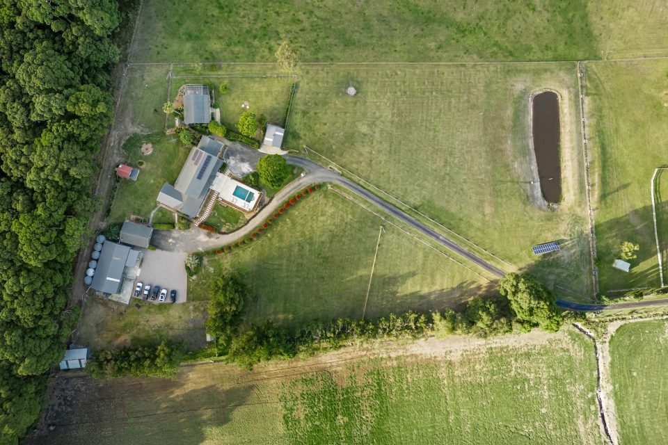 Arriving via a private driveway, the property opens into a sweeping panorama of paddocks, a 650,000-litre dam and long views over a neighbouring winery that roll all the way out to Seven Mile Beach.