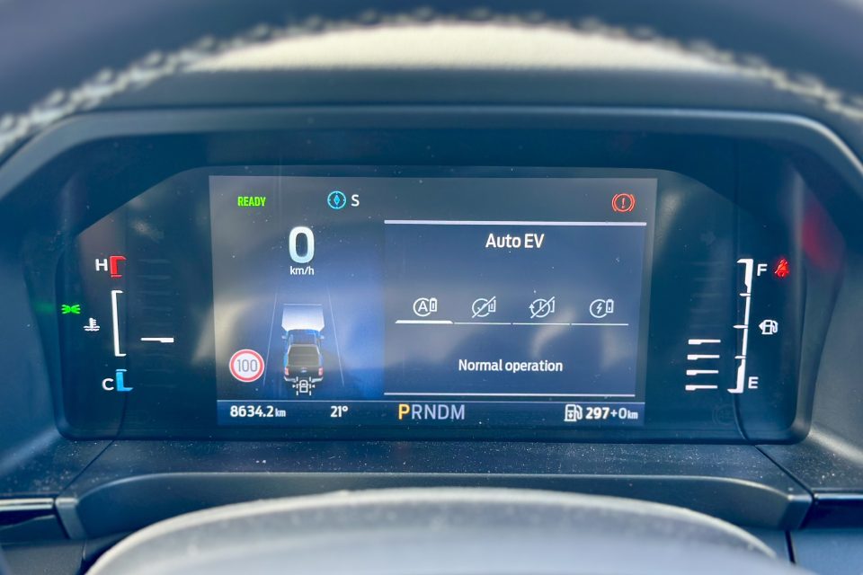 Press the EV button, and you can scroll through four modes: ‘Auto EV’ behaves like a normal hybrid, alternating between the two systems, ‘EV Now’ turns the Ranger into a full EV, ‘EV Later’ turns the electric motor off to save the battery charge, while ‘EV Charge’ uses the engine to top up the battery.