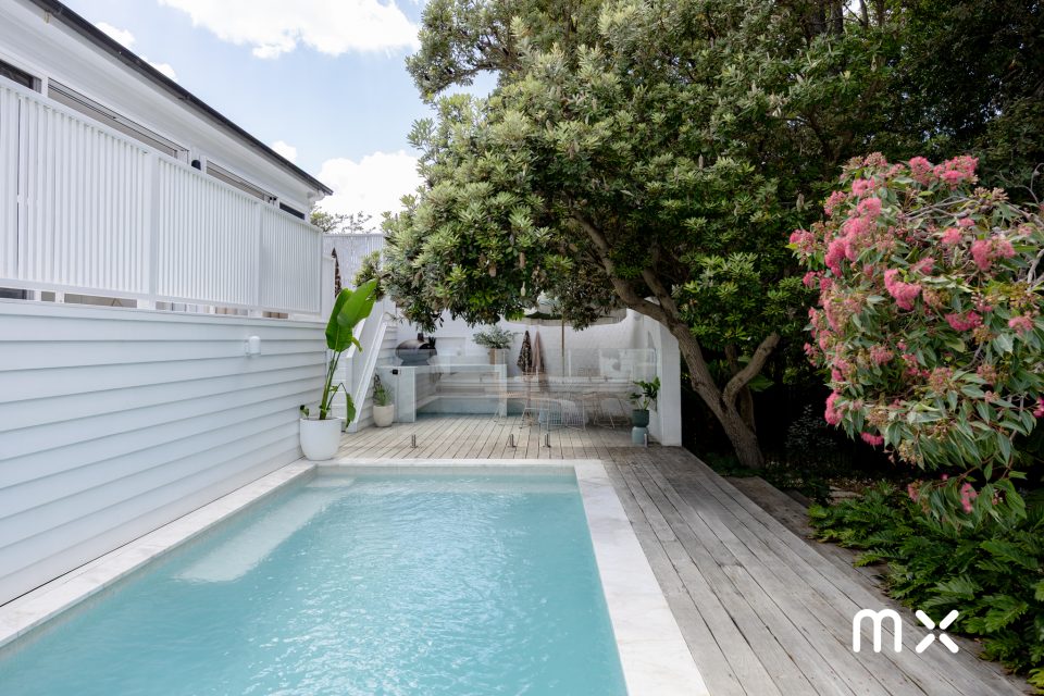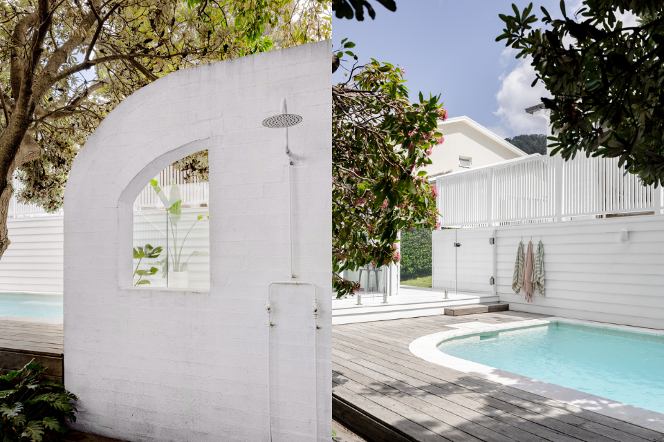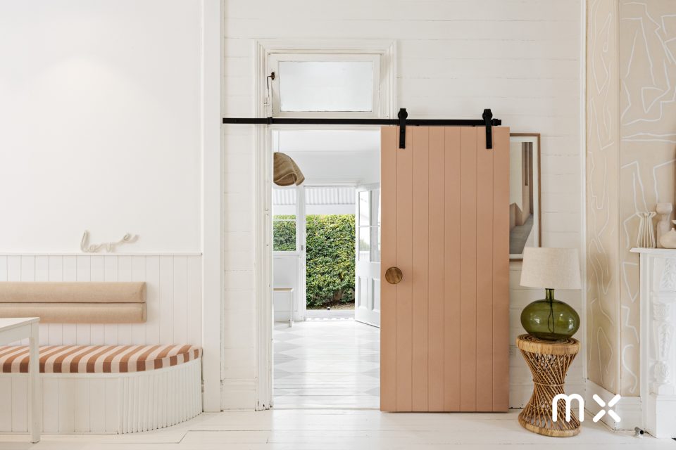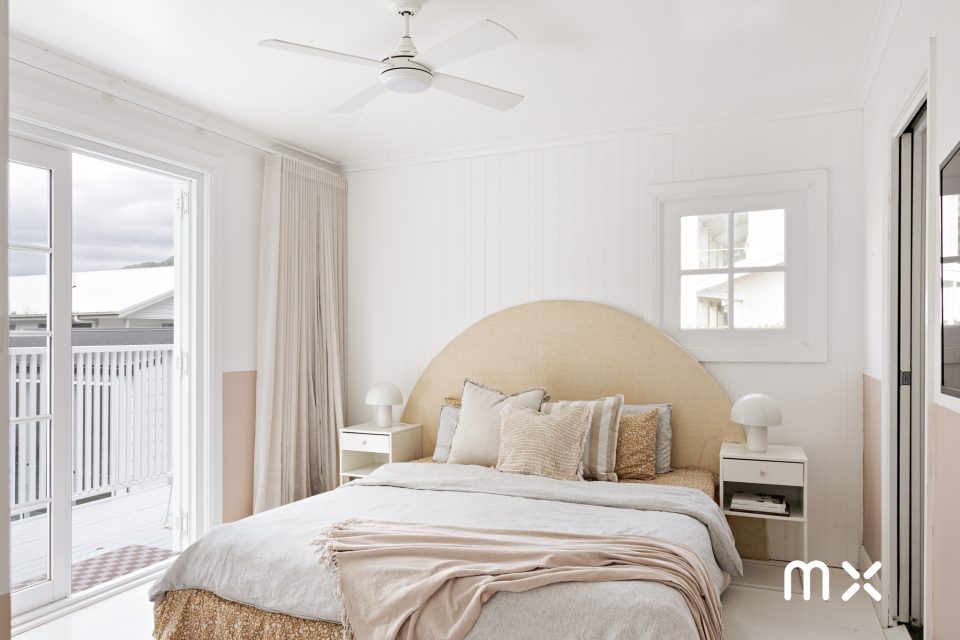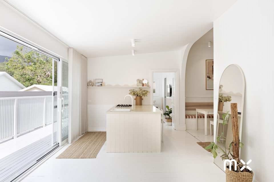 Inside, the visually stunning main residence is characterised by fresh white interiors enhanced by Scandi-inspired finishes, archways, French doors, high ceilings, soft blush accents, statement wooden floors and coloured glass features.