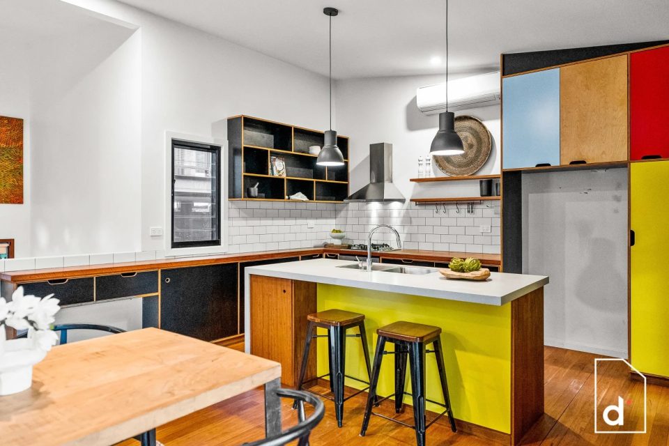 The curated kitchen brings an unexpected sense of theatre and warmth, with a blend of stone and timber, handcrafted subway tiles, bold colour notes and rich textures.