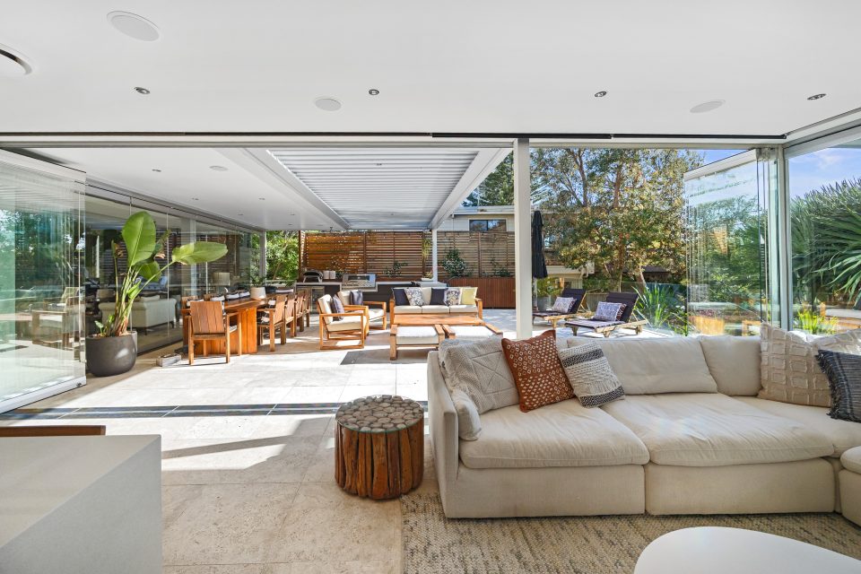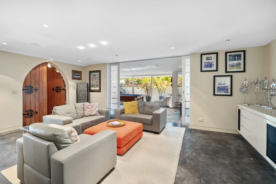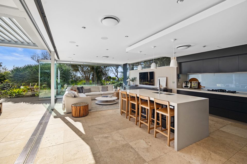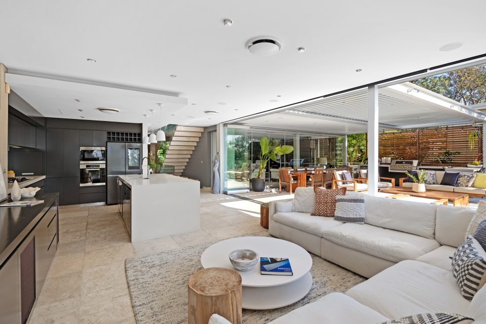 Open-plan living spaces flow effortlessly into the premier kitchen, which features top-of-the-line Miele appliances, stone benchtops and custom cabinetry.