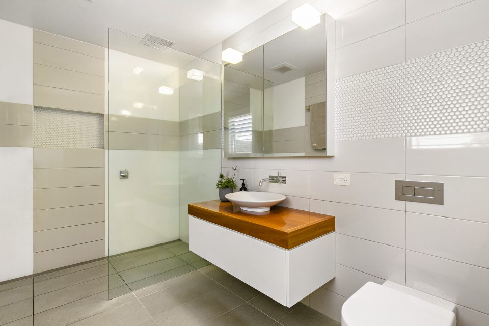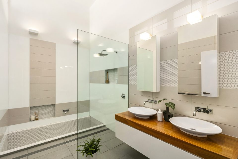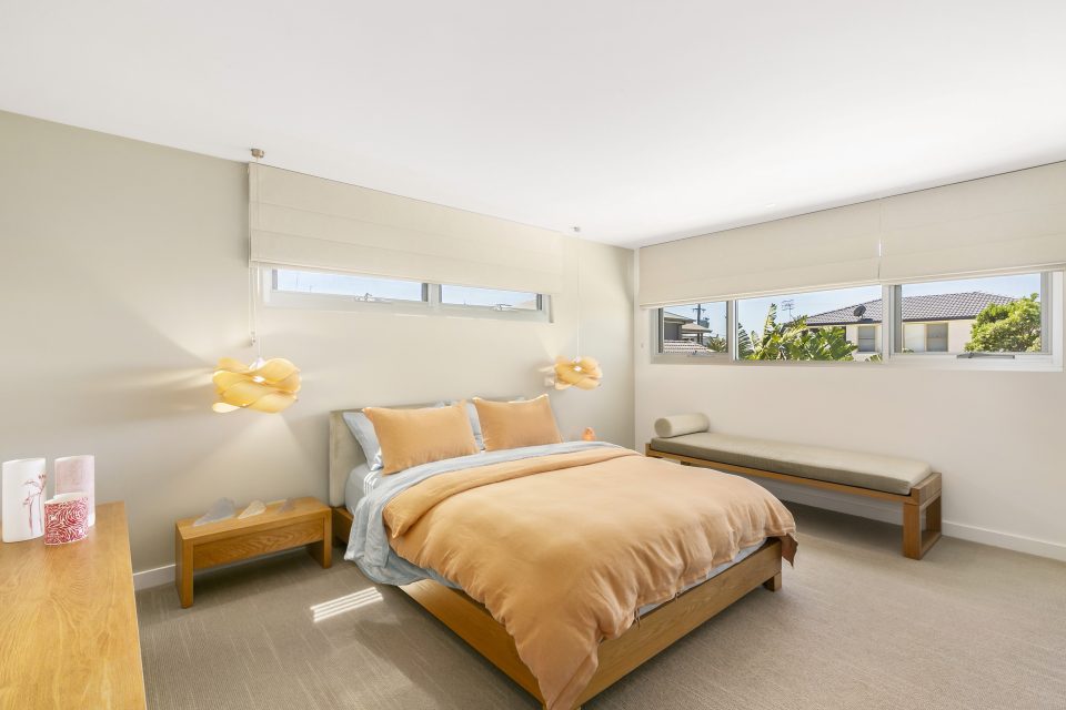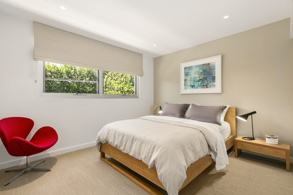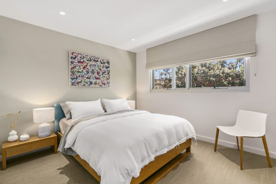 On the second level, three airy bedrooms and a beautifully crafted bathroom create a peaceful haven, complete with a floating timber vanity, frameless glass shower and tiles that lend quiet texture and warmth.