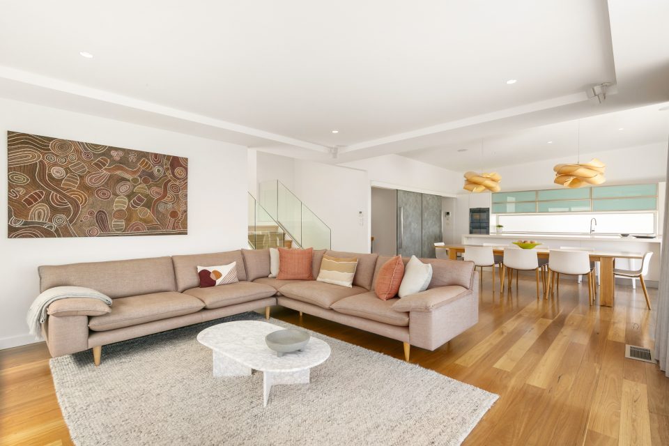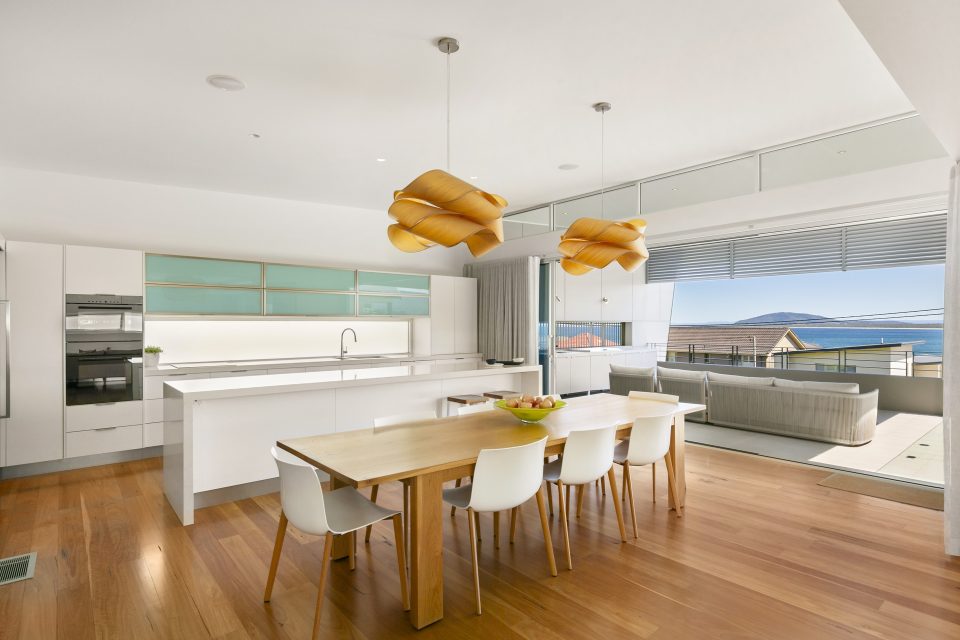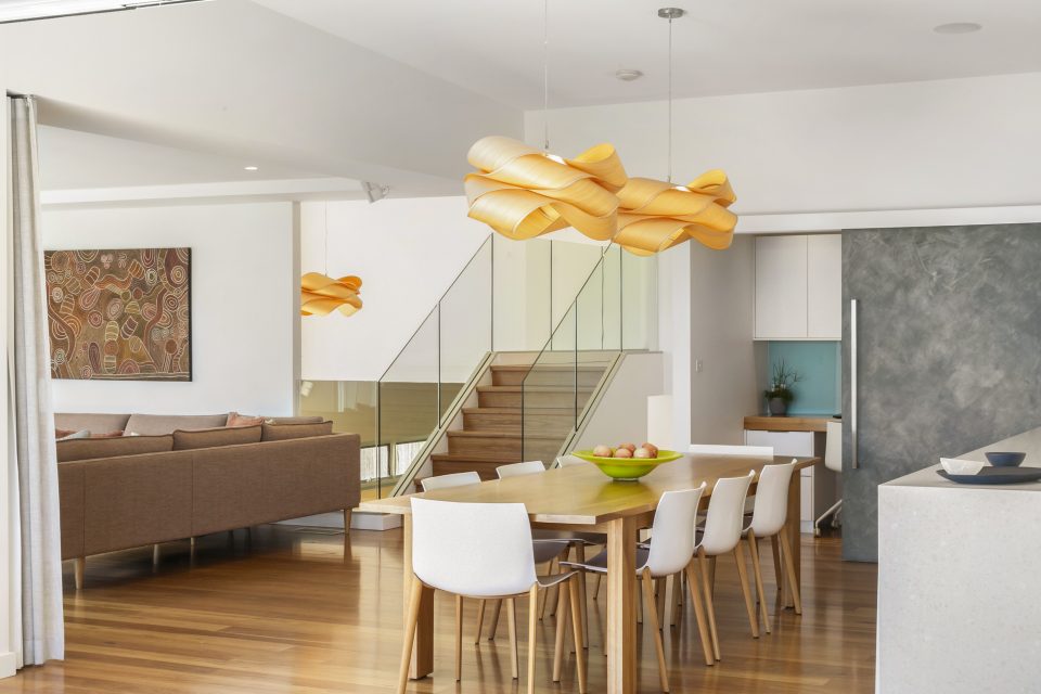 Above the dining area, designer pendant lights double as art pieces, complementing the rich blackbutt timber floors that carry warmth and continuity through the home.