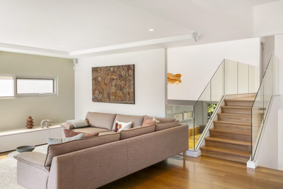 Instead of two levels divided by a full staircase, the home unfolds across four gentle tiers, inviting an effortless flow between living and entertaining zones.