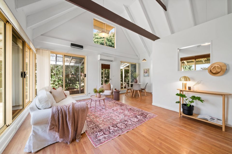 “The main living space is open and airy, with raked ceilings, exposed beams and large windows that bring in plenty of natural light.